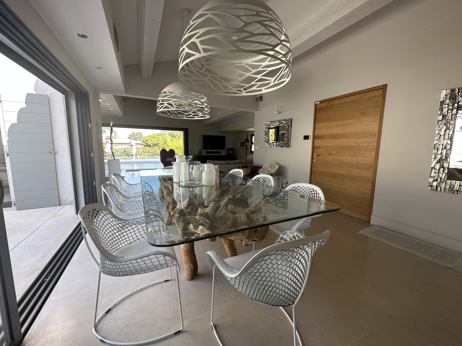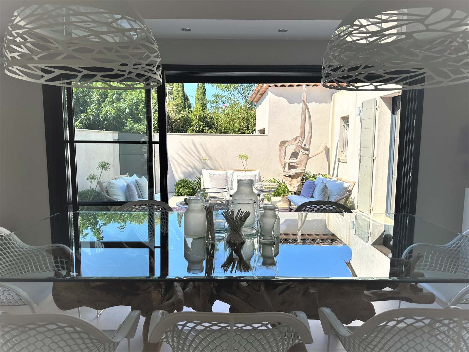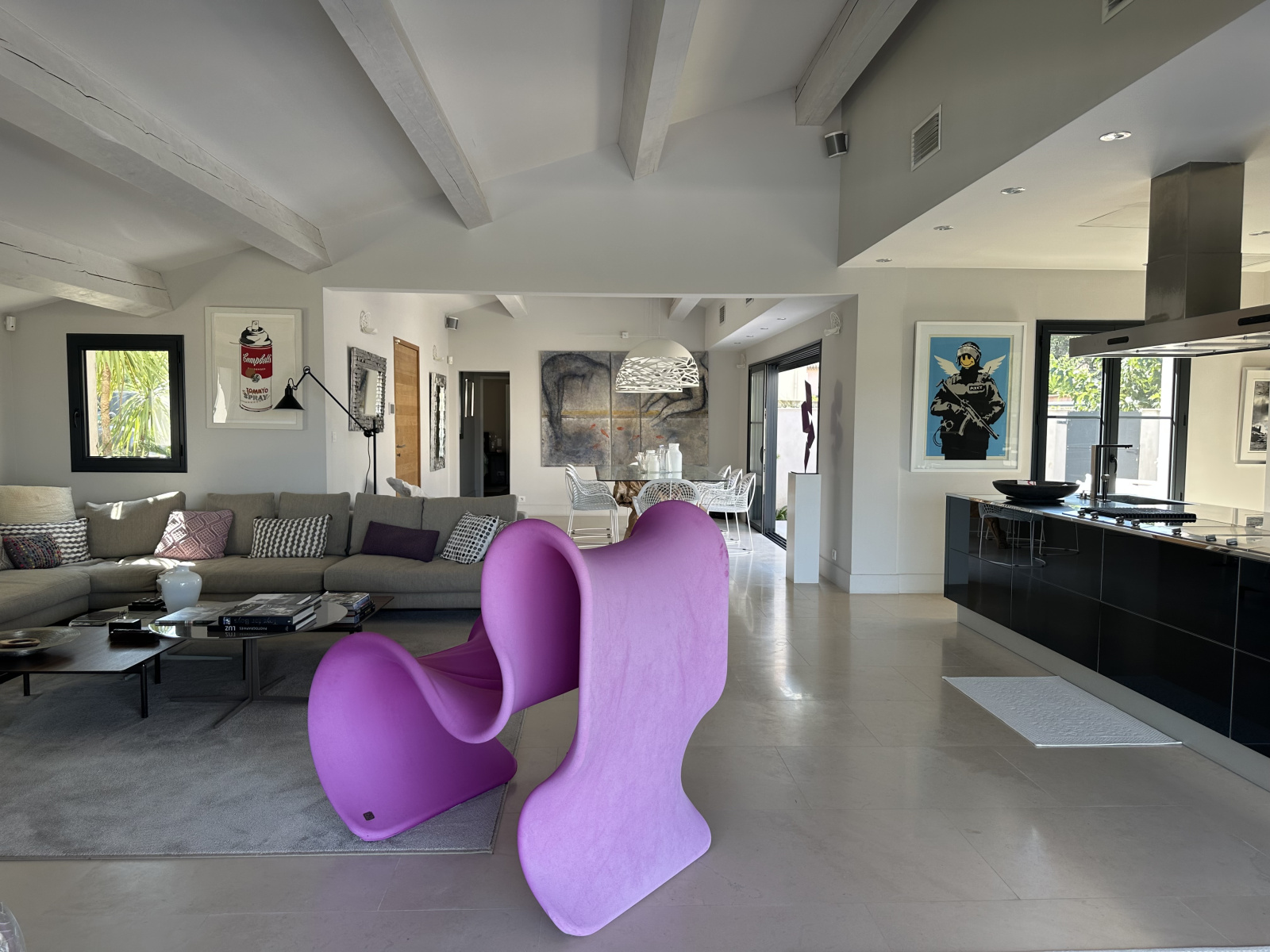 L'espace intérieur se compose au RDC d'un salon/séjour/salle à manger d'environ 80 m², de 2 chambres dont une chambre master et un espace cuisine. A l'étage, 2 chambres avec salles d'eau dont une avec terrasse privative.